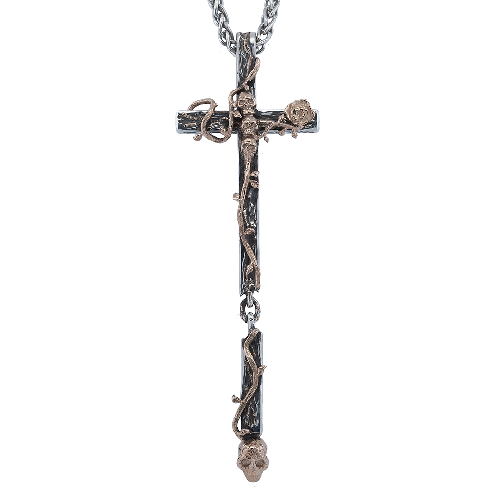 Pendentif Argent "Croix Rose Crânes Ou"